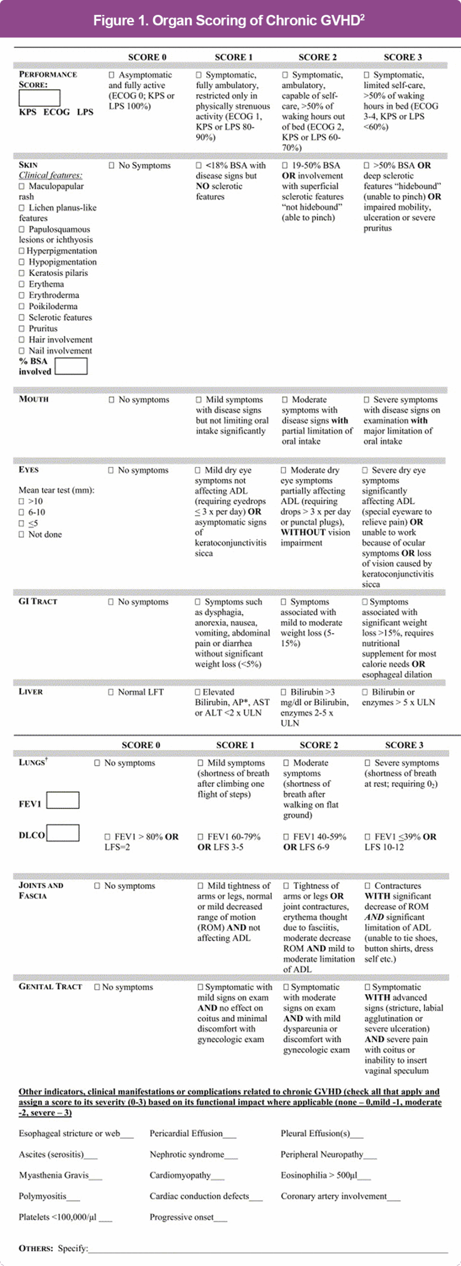 Kitko CL, Pidala J, Schoemans HM, et al. National Institutes of Health Consensus Development Project on criteria for clinical trials in chronic graft-versus-host disease: IIa. The 2020 Clinical Implementation and Early Diagnosis Working Group Report. Transplant Cell Ther. 2021;27(7): 545-557. https://doi.org/10.1016/j.jtct.2021.03.033
