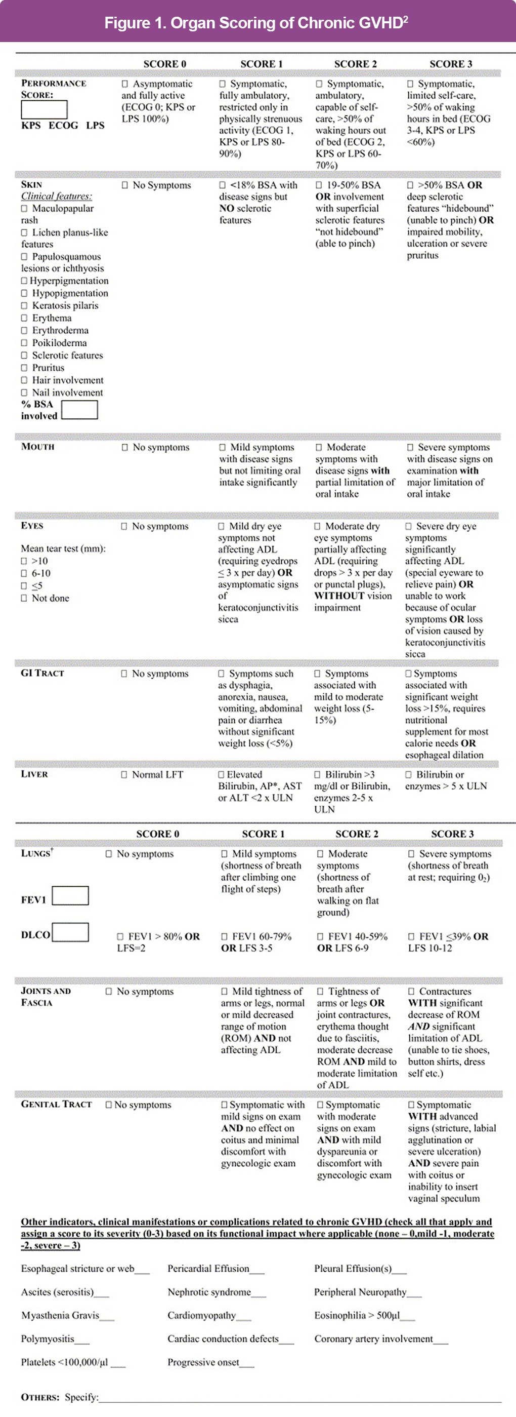 Grading of cGVHD follows the National Institutes of Health (NIH) Consensus Development Project criteria using an organ-based scoring system that evaluates the skin, mouth, eyes, gastrointestinal tract, liver, lungs, joints and fascia, and female genital tract. Each site is rated on a 0 to 3 scale, where 0 indicates no involvement and 3 indicates severe impairment. Performance status is also scored from 0 to 3, with additional checkboxes used to document other specific manifestations. Importantly, the assessment (Figure 1) is based solely on the patient’s current clinical status, without regard to prior findings or the need to distinguish cGVHD-related abnormalities from preexisting conditions.1