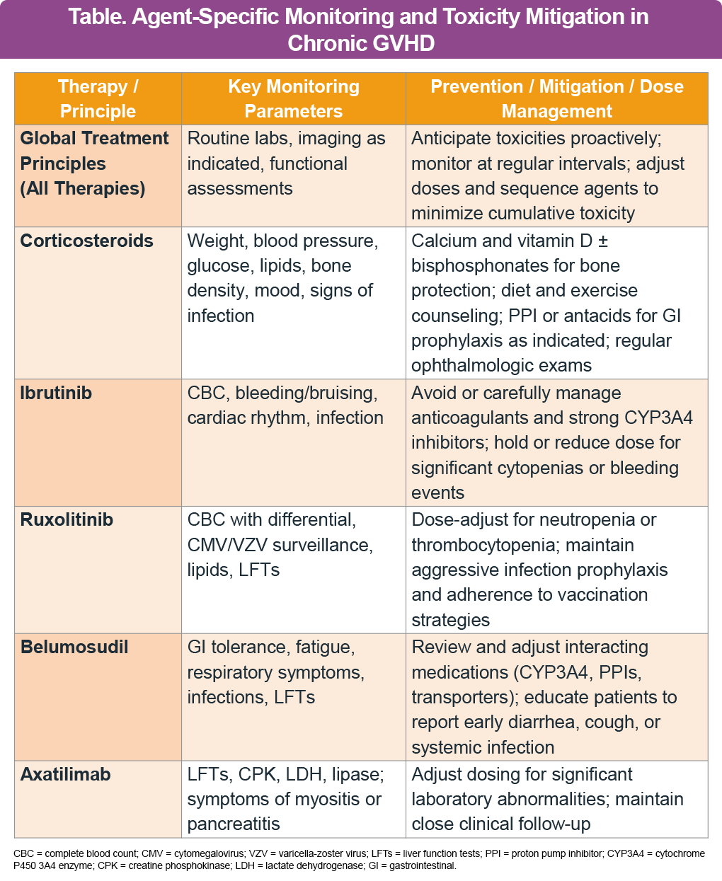 Treatment of cGVHD requires proactive toxicity anticipation, regular multidisciplinary monitoring (including laboratory studies, imaging, and functional assessments), and thoughtful dose adjustment and sequencing to limit cumulative adverse effects.1,2