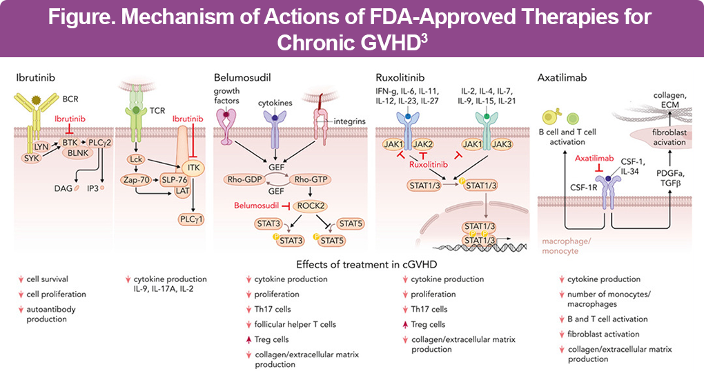 Once cGVHD is steroid-refractory or steroid-dependent, targeted agents play a key role. The US Food and Drug Administration (FDA) has approved 4 oral agents for steroid-refractory cGVHD, each targeting distinct immune and fibrotic pathways (Figure).2,4