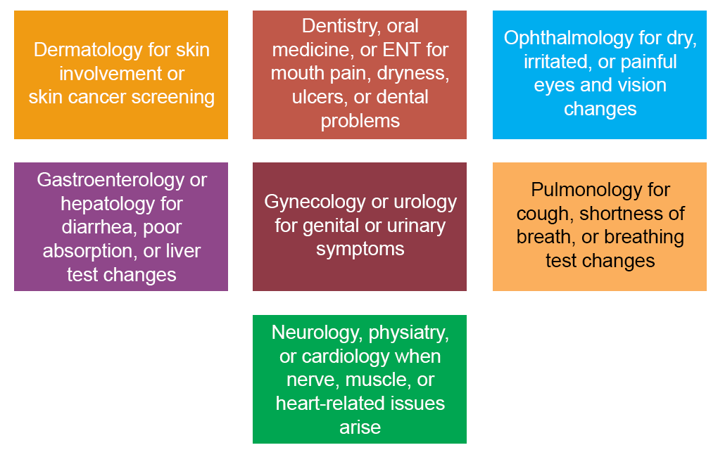 Your transplant team remains the central point of contact throughout your care and coordinates communication across all specialists. Managing cGVHD requires a team approach because different organs may be affected at different times. Core members of your team typically include your transplant physician and advanced practice provider, a transplant nurse or nurse navigator, a pharmacist to manage complex medications, a social worker or mental health professional for emotional support, a dietitian, and physical or occupational therapists.2,3