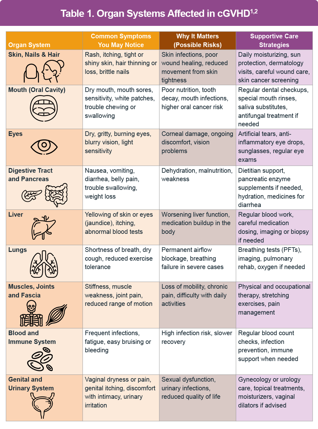 Chronic GVHD can affect many parts of the body. Table 1 shows which organs may be involved, common symptoms to watch for, possible health risks, and typical supportive care.1,2