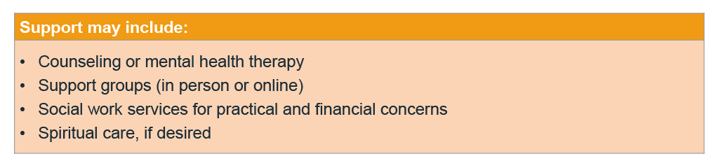 Supportive care is an essential part of living with cGVHD. It is available to everyone with cGVHD, at any stage of the disease—not just at the end of life. Supportive care focuses on helping you feel as well as possible by preventing and managing symptoms, reducing treatment side effects, and supporting your physical, emotional, and practical needs. You may also hear this called palliative care. It can be provided alongside your cGVHD treatment.2
