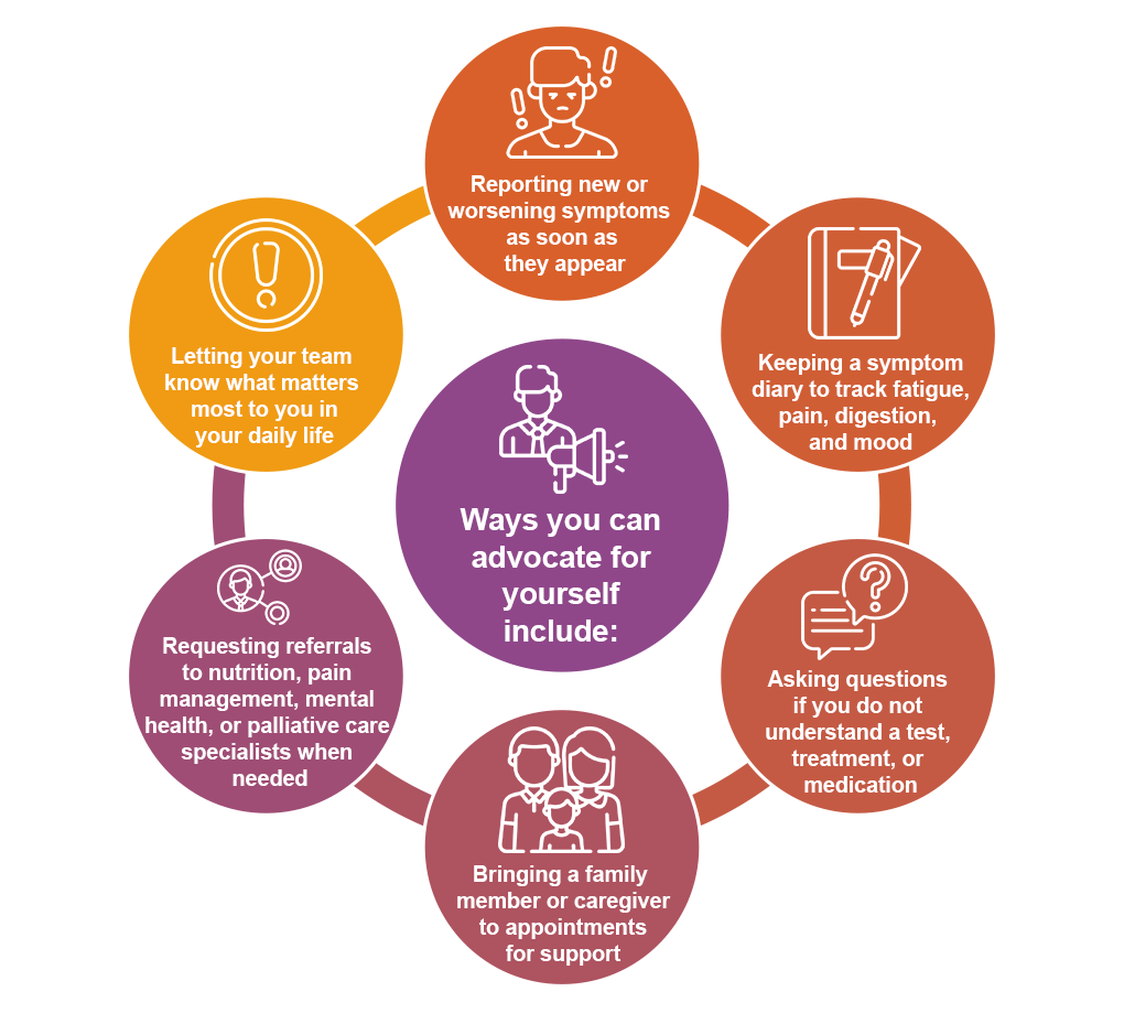 You play a critical role in your own supportive care. Being an advocate for yourself means speaking up about your symptoms, concerns, and goals so your care team can respond quickly and effectively.2,3